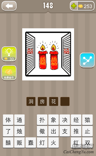 看图猜成语、疯狂猜成语第148关图片中,窗子里面有两个红色的蜡烛,蜡烛上是两个喜字,双喜囍字,答案是什么成语?