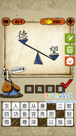 成语玩命猜游戏中,一个跷跷板上,德字在上面,望字在下面的成语是什么?