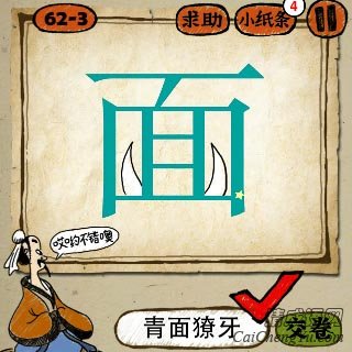 猜谜题目: 疯狂猜成语图片中,一个青色的面字,上面两个獠牙/两只牛角是什么成语
