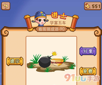 【图解】这幅图中看见一个炸弹跟一个碗在一片地上,把它们结合起来就可以想到成语弹丸之地