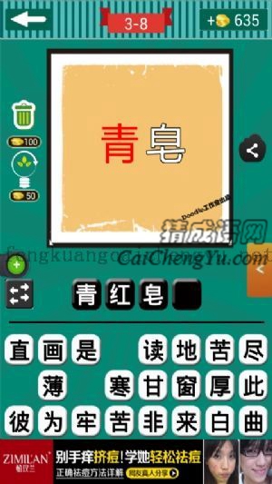 图中从一个红色的青字和一个白色的皂字就可以想到是成语青红皂白。